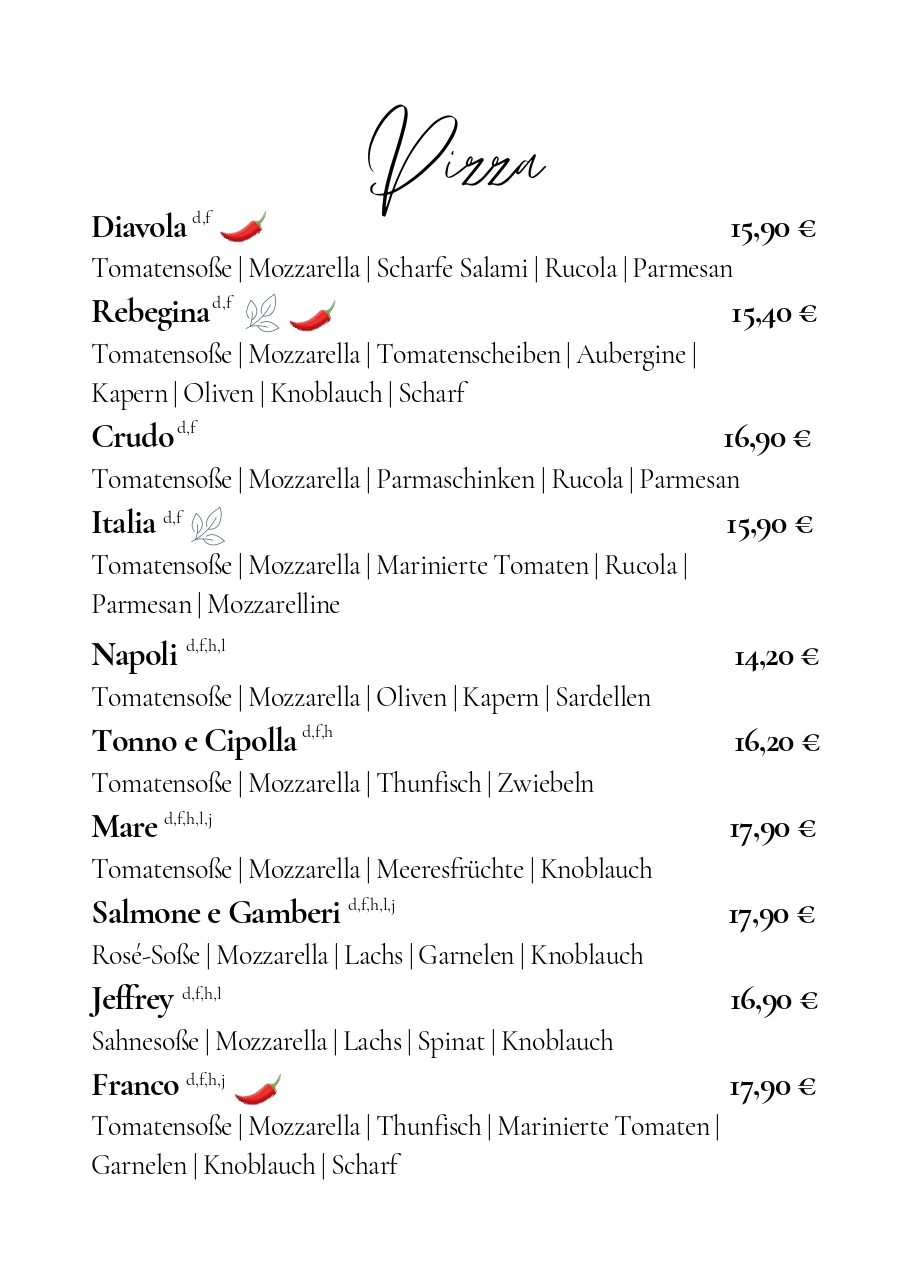 Tomatensauce | Fior di latte Mozzarella | Schinken | Pilzen | Artischocken | Kapern | Sardellen | Oliven