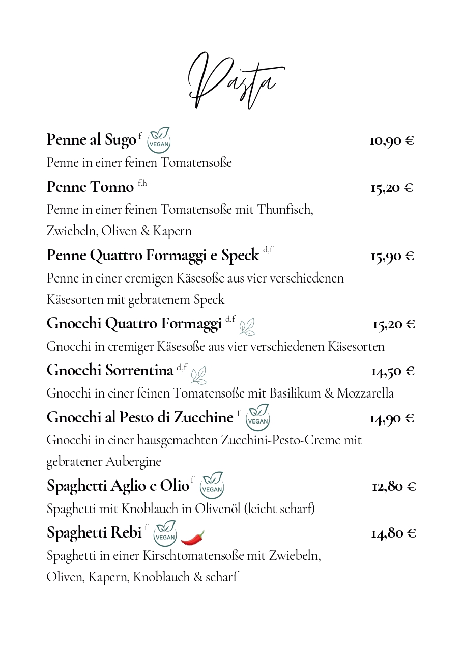 Denn, Pasta gehört zu Italien wie Pferd zu Reiter. Wir bereiten für Sie das zweite Nationalgericht Italiens (neben Pizza) in verschiedensten Formen, Größen und Saucen zu.