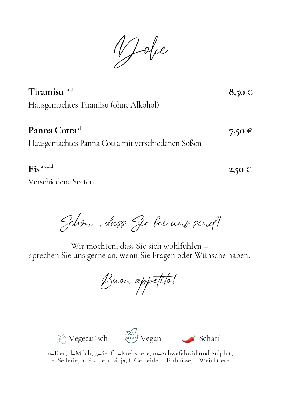 Erhalten Sie auf Anfrage eine detaillierte Auflistung dieser Allergene und Zusatzstoffe – Sprechen Sie hierfür unser Servicekraft an!