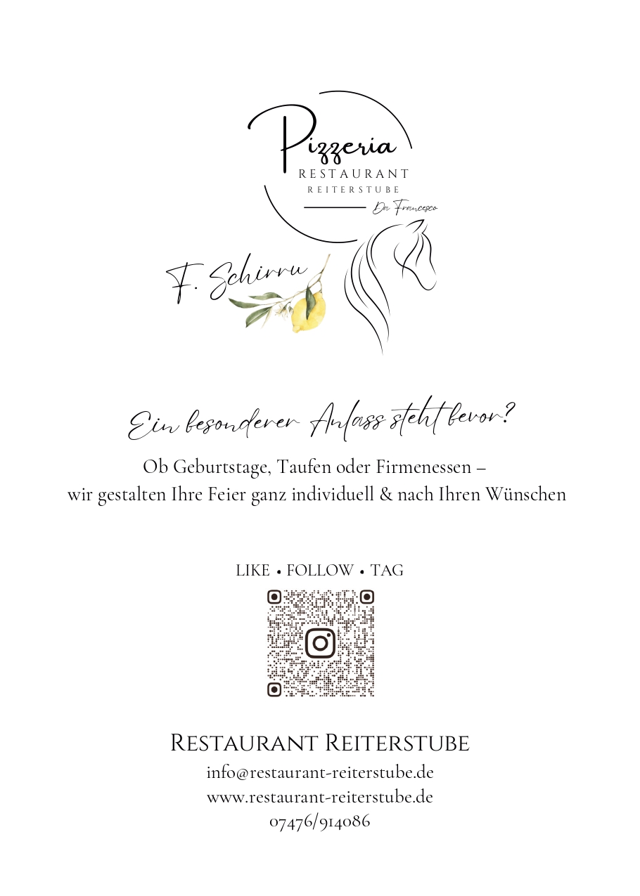 Pasta fresca (italienisch für frische Pasta), in unserem Fall nicht nur frische, sondern hausgemacht! Rezept und Herstellung erfolgt in der Reiterstube, damit wir Sie Ihnen jederzeit frisch als Beilage oder Hauptgericht auf den Teller bringen können.